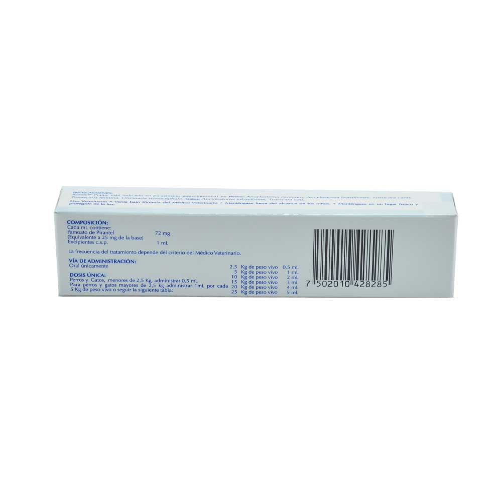 Contiene Pamoato de pirantel, agente antihelmíntico que actúa causando parálisis y desprendimiento de los parásitos del tracto intestinal.