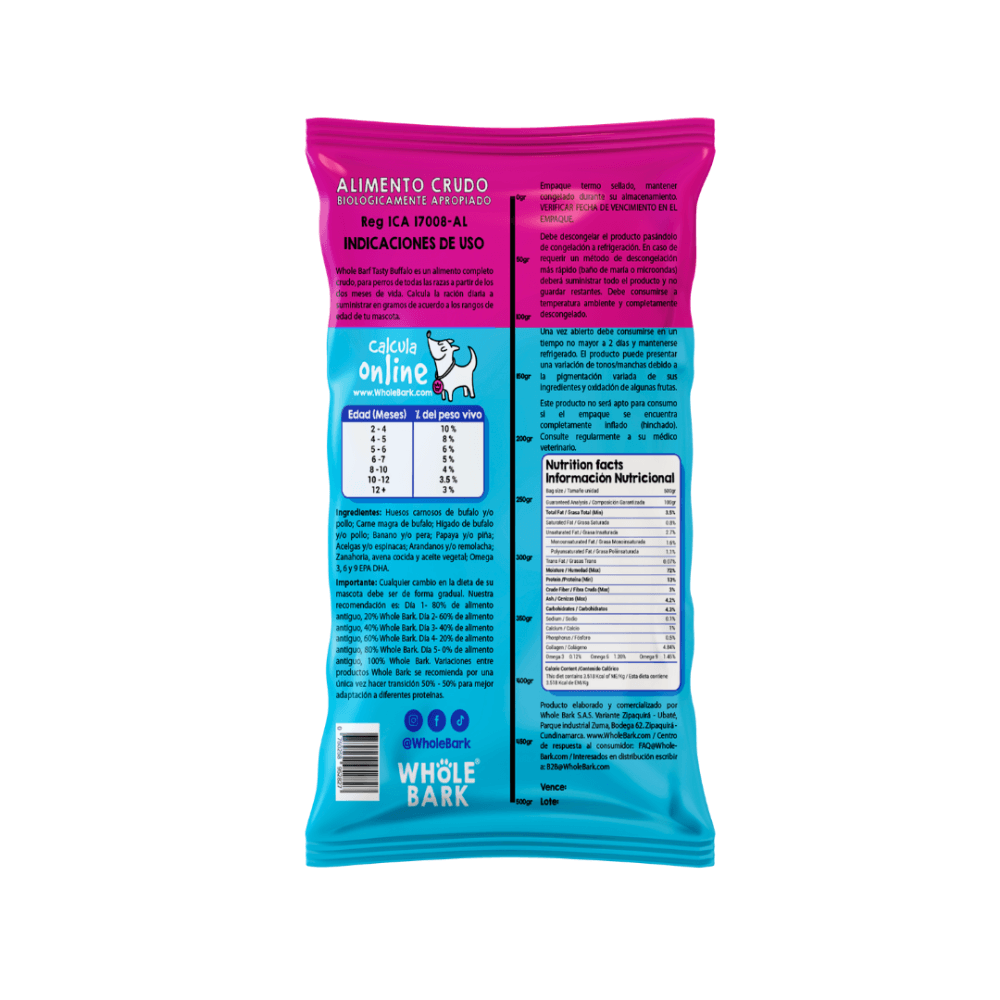Whole Barf® Tasty Buffalo es un alimento completo y balanceado, elaborado con carne de búfalo para brindar una fuente de proteína de alta calidad y fácil digestión.