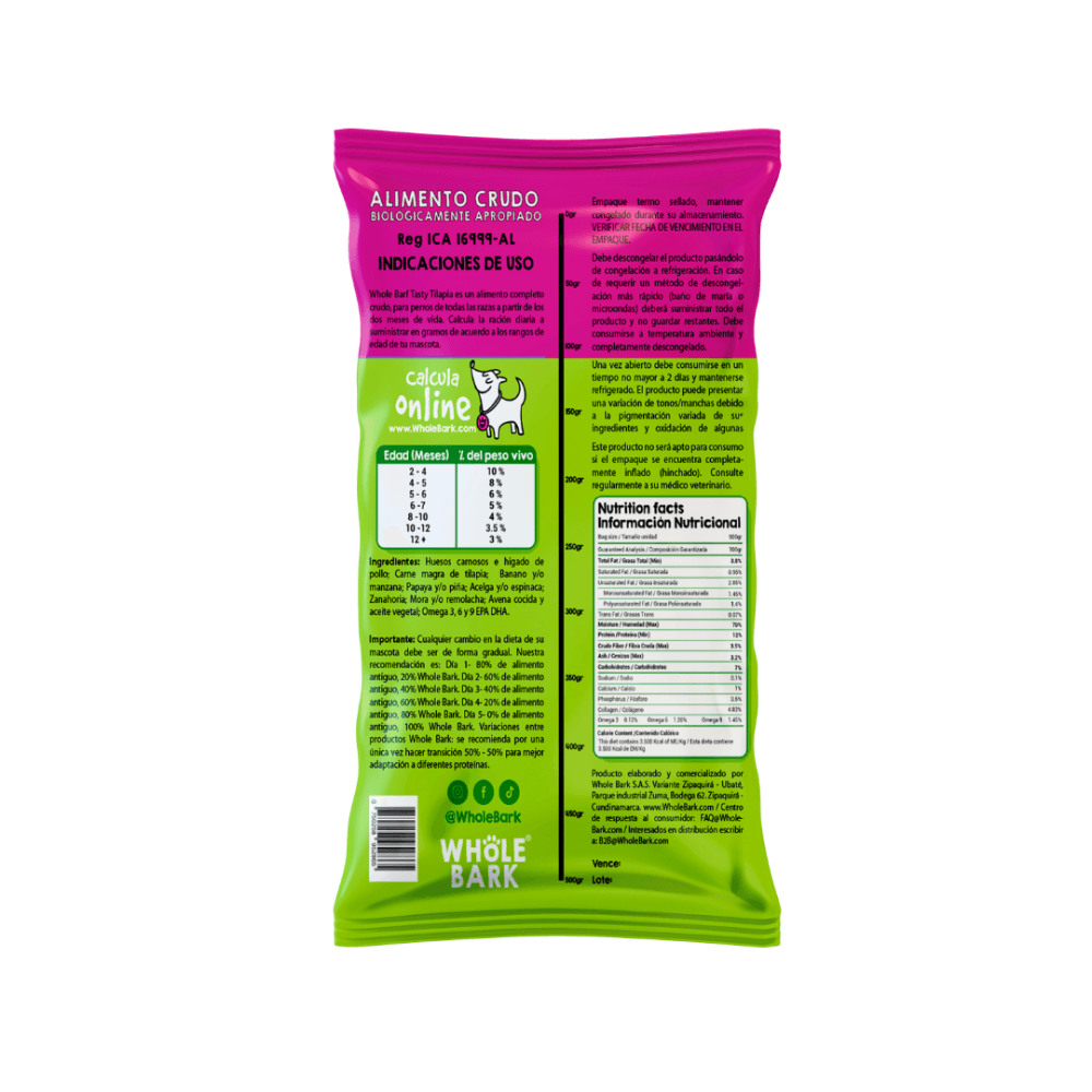 Whole Barf® Tasty Tilapia es un alimento completo y balanceado, elaborado con tilapia como fuente de proteína de alta calidad, ideal para una nutrición óptima en perros de todas las razas y edades (a partir de los 2 meses).